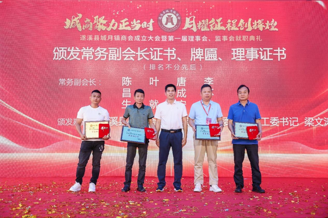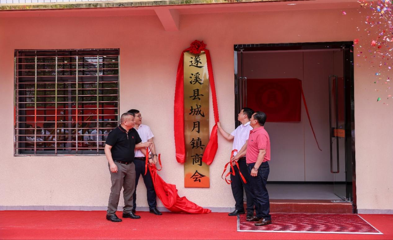县委常委、统战部部长朱凌静、城月镇党委书记王武庆、城月镇商会会长邓发春、城月镇商会名誉会长陈树伟共同为商会揭牌。