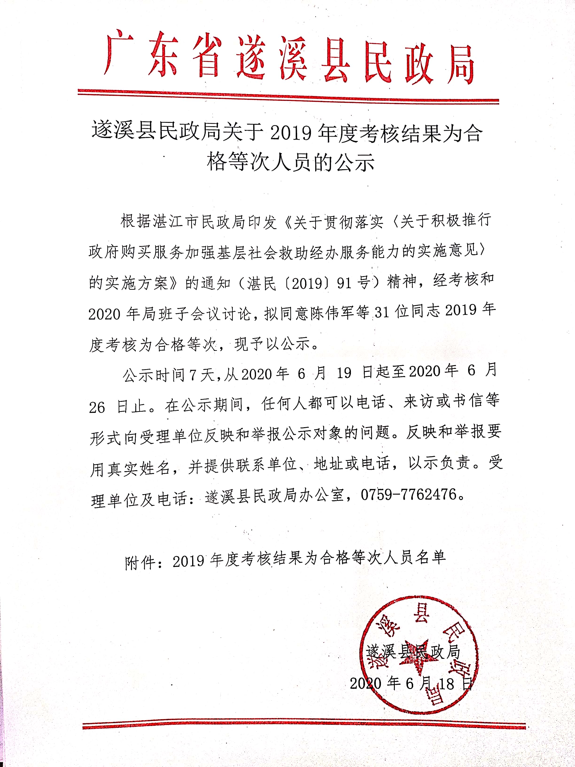 遂溪县民政局关于2019年度考核结果为合格等次人员的公示