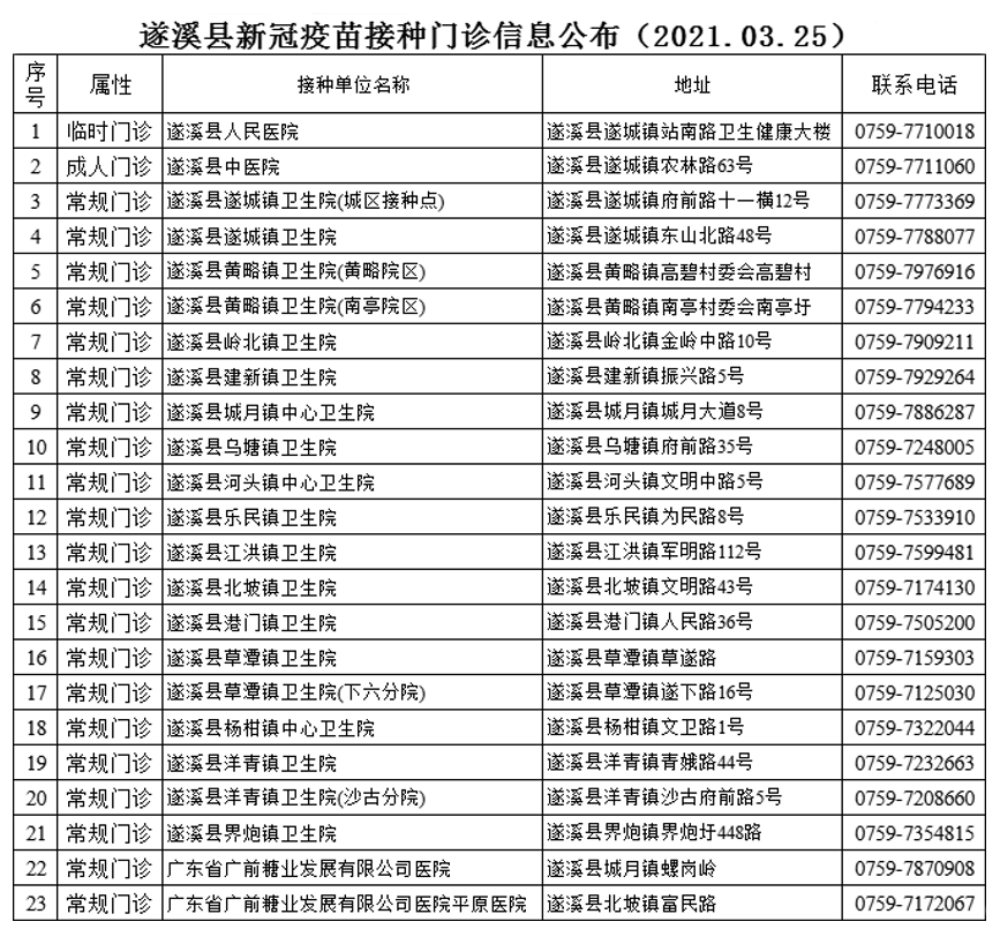 目前,我县共设置新冠疫苗接种点23个,覆盖全县15个乡镇。其中遂溪县人民医院临时接种点1个、遂溪县中医院成人接种门诊1个、15个乡镇卫生院(含分院)的常规预防接种门诊19个、广前医院和平原医院常规预防接种门诊各1个。