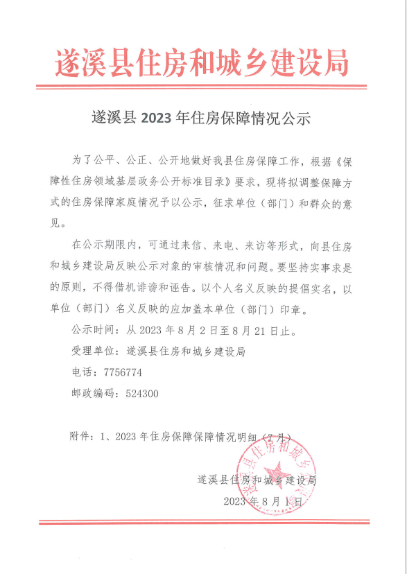 遂溪县2023年住房保障情况公示 | | 作者: | 来源:遂溪县住房和城乡建设局 | 时间:2023-08-02 10:56:53 点击数:- 详见附件:2023年住房保障调整家庭明细(7月).xlsx 【打印正文】