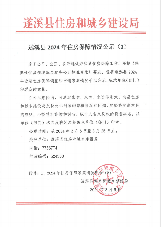 遂溪县2024年住房保障情况公示(2) | | 作者: | 来源:遂溪县住房和城乡建设局 | 时间:2024-03-05 17:01:14 点击数:- 遂溪县2024年住房保障情况公示(2).pdf 【打印正文】