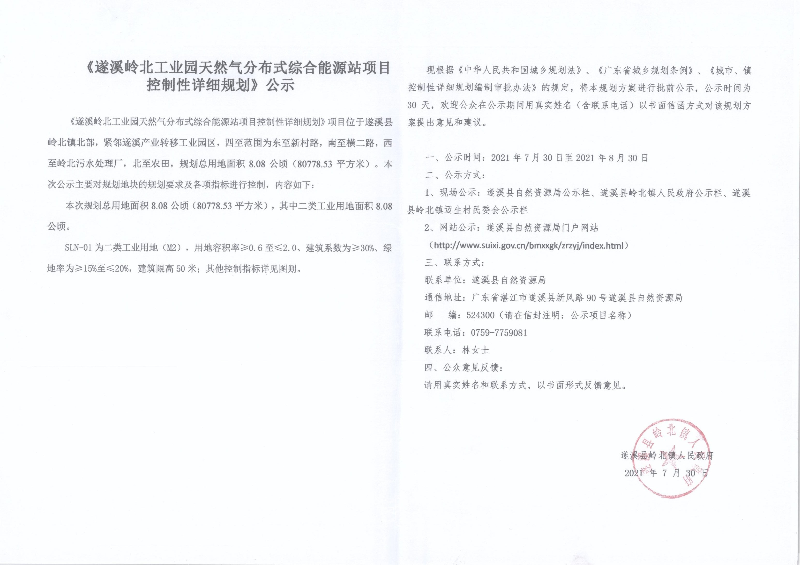 《遂溪岭北工业园天然气分布式综合能源站项目控制性详细规划》公示