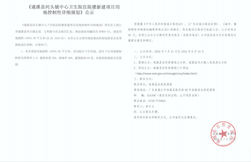 关于《遂溪县河头镇中心卫生院住院楼新建项目用地控制性详细规划》的公示