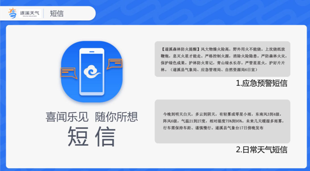 服务内容:提供全县天气预报、灾害性天气预警以及气象热点、专家访谈等服务。