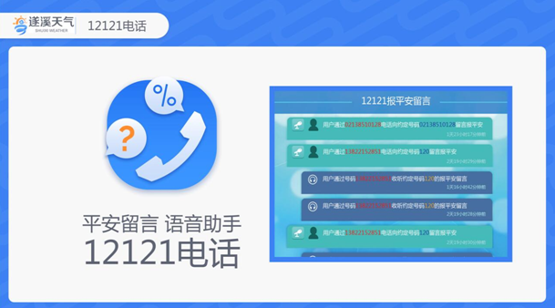 “12121”应急气象电话是查询天气信息的专用电话服务号。2012年起新增“巨灾报平安”服务功能,发生巨灾时,公众可拨打“12121”向亲朋留言报平安。