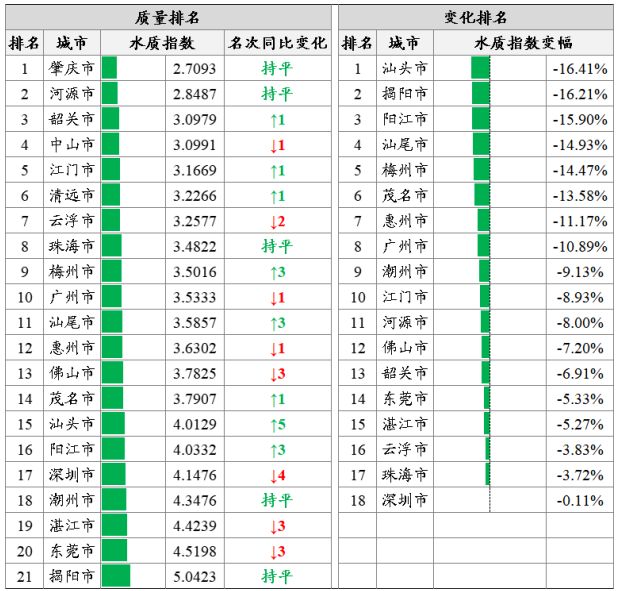 城市排名:1-10月,基于149个国控断面水质监测结果,按照城市水质指数由低到高排名,全省水环境质量前三名为肇庆、河源和韶关市,后三名由高到低为揭阳、东莞和湛江市。汕头、揭阳、阳江等18市水环境质量同比均有所改善(中山、肇庆、清远市所有国控断面均达到水质目标且均达到或优于Ⅱ类,不参与水质变化排名)。