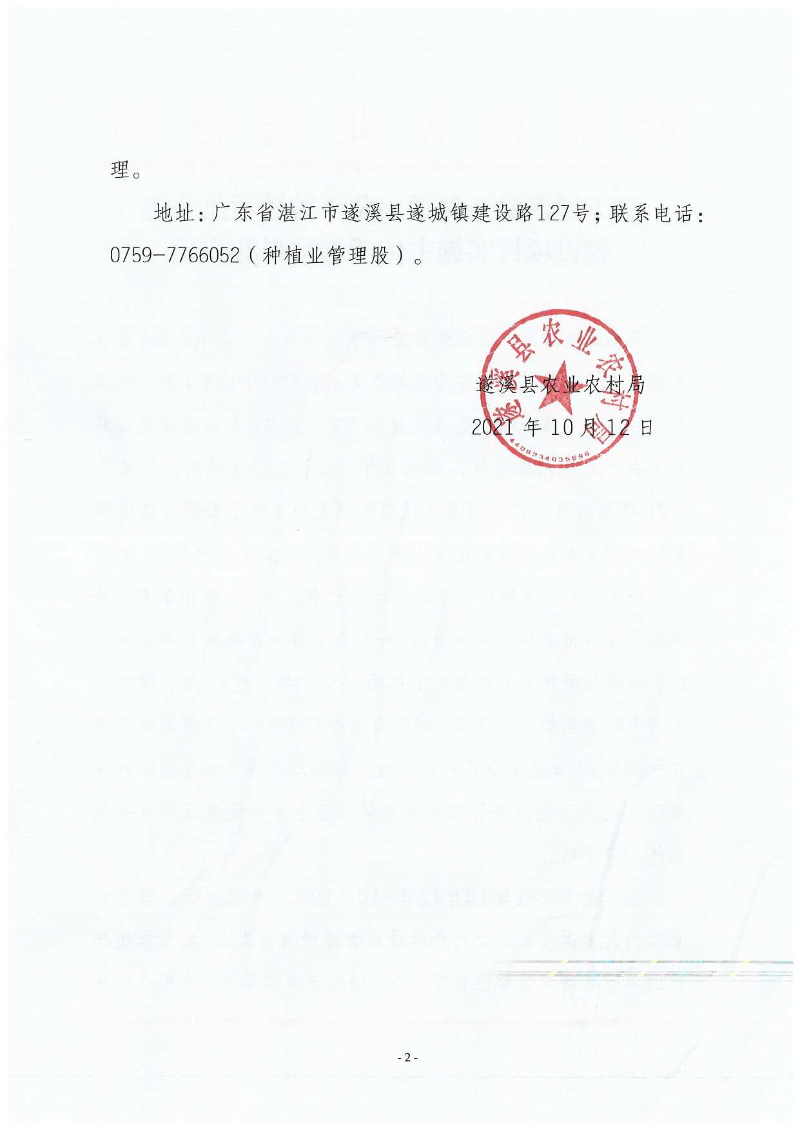 关于遂溪县智慧型火龙果种植示范基地建设项目实施主体遴选结果的公示 | | 作者: | 来源:本网 | 时间:2021-10-12 15:36:50 点击数:- 关于遂溪县智慧型火龙果种植示范基地建设项目实施主体遴选结果的公示pdf.pdf 【打印正文】