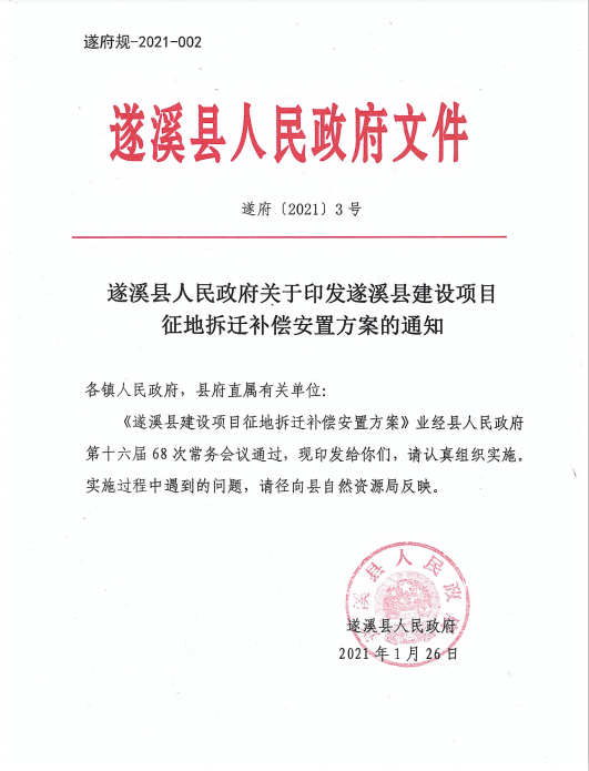 遂府规-2021-002遂溪县人民政府关于印发遂溪县建设项目征地拆迁补偿安置方案的通知(遂府〔2021〕3号) | | 作者: | 来源:遂溪县自然资源局 | 时间:2021-01-27 17:29:25 点击数:- 政策解读链接:《遂溪县建设项目征地拆迁补偿安置方案》的政策解读 附件1:遂府规-2021-001遂溪县人民政府关于印发遂溪县建设项目征地拆迁补偿安置方案的通知(遂府〔2021〕3号).pdf 【打印正文】