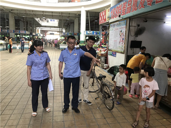 三、迅速推进点位建设工作。按照县创文办任务分工,遂溪县市场监督管理局共承担12个点位创建任务,主要包括2个农贸(集贸)市场和4个大型商场超市等。规范治理遂城新中心市场与遂溪城内市场,指导市场经营方对摊位设置进行规范整治,严防经营户占道经营现象发生,确保摊位摆放整齐有序。指导各大型商场、超市守法文明经商进一步做好创文工作。一是要亮照经营,自觉增强商铺创文宣传氛围,不堵塞消防通道,设置禁烟标志,劝导及制止吸烟行为,热情待客。二是要落实保洁制度。物业管理公司要落实环境保洁,垃圾桶要加盖,垃圾及时清运。三是要督促员工挂牌上岗,按岗位负责制将创文工作落实到每人。