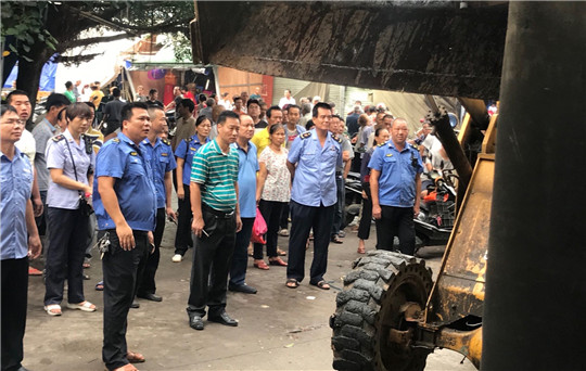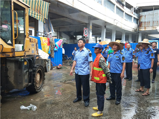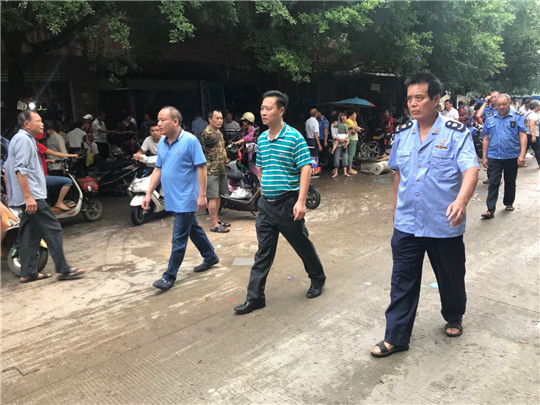 一是领导带队,全面发力。针对群众反映遂城东圩市场“六乱”乱象比较突出的问题,遂溪县市场监督管理局局长陈赵成、遂溪县城市管理和综合执法局局长庞应发等亲自带队,每天出动60多人,执法宣传车5台,施工铲车2台,垃圾清运车2台,形成强大的执法队伍,持续发力对遂城东圩市场“六乱”乱象进行全面整治。