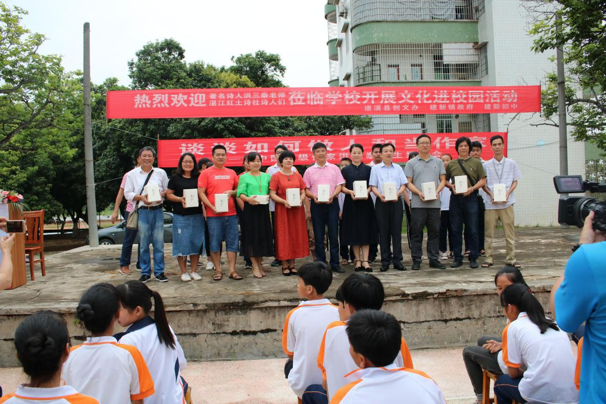 5 月 20 日下午,由遂溪县创文办、建新镇政府、建新镇初级中学联合主办的“文化进校园”活动在建新镇初级中学举行。著名诗人、国家一级作家洪三泰出席并作了“如何做人和当作家” 的主题讲座。湛江红土诗社诗人和建新镇初级中学师生共400多人参加。《湛江日报》副总编辑、《湛江晚报》总编辑陈通,县政协副主席、县创文工作领导小组执行副组长、县创文办主任张闽英,县委宣传部副部长周虹出席活动。