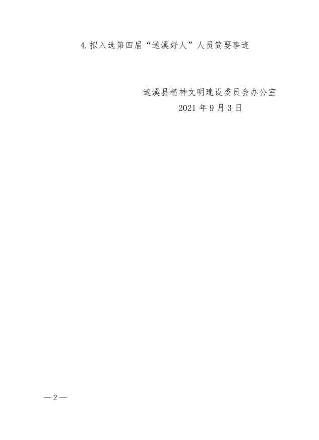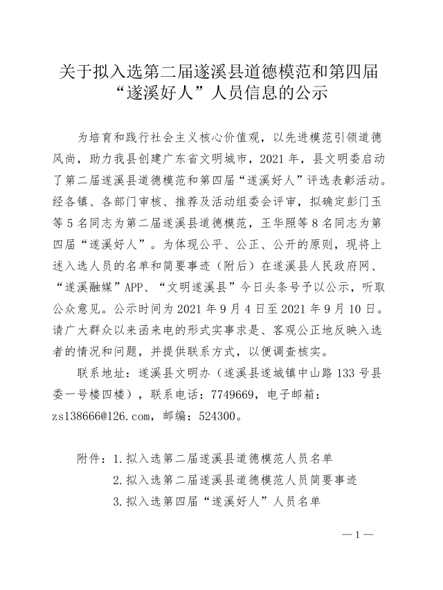 关于拟入选第二届遂溪县道德模范和第四届“遂溪好人”人员信息的公示 | | 作者: | 来源:遂溪县精神文明建设委员会办公室 | 时间:2021-09-03 18:03:34 点击数:- 具体事迹请看附件:关于拟入选第二届遂溪县道德模范和第四届”遂溪好人“人员的公示.pdf 【打印正文】