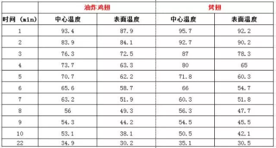 制作完成之后,分别测定食物30分钟内中心温度和表面温度的变化。