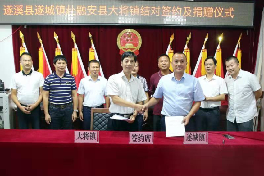 9月12日,在融安县大将镇举行了扶贫协作镇村结对帮扶座谈会,遂城镇陈泽和镇长、遂城镇城内社区支书廖窕权以及大将镇罗财政书记、大将镇保安村支书周玉健先后介绍了各自镇村基本情况,双方就脱贫攻坚、产业发展、党建工作、以及自然资源禀赋进行了交流探讨,并就下一步如何开展消费扶贫促进扶贫协作镇村结对帮扶实效等进行了深入讨论。座谈会上,遂城镇与大将镇、遂城镇城内社区与大将镇保安村分别签订了结对帮扶协议,遂城镇向大将镇捐赠了8万元的帮扶资金和16辆电动车,用于解决扶贫工作队员进村入户时的交通工具问题。城内社区向保安村捐赠资金2万元。