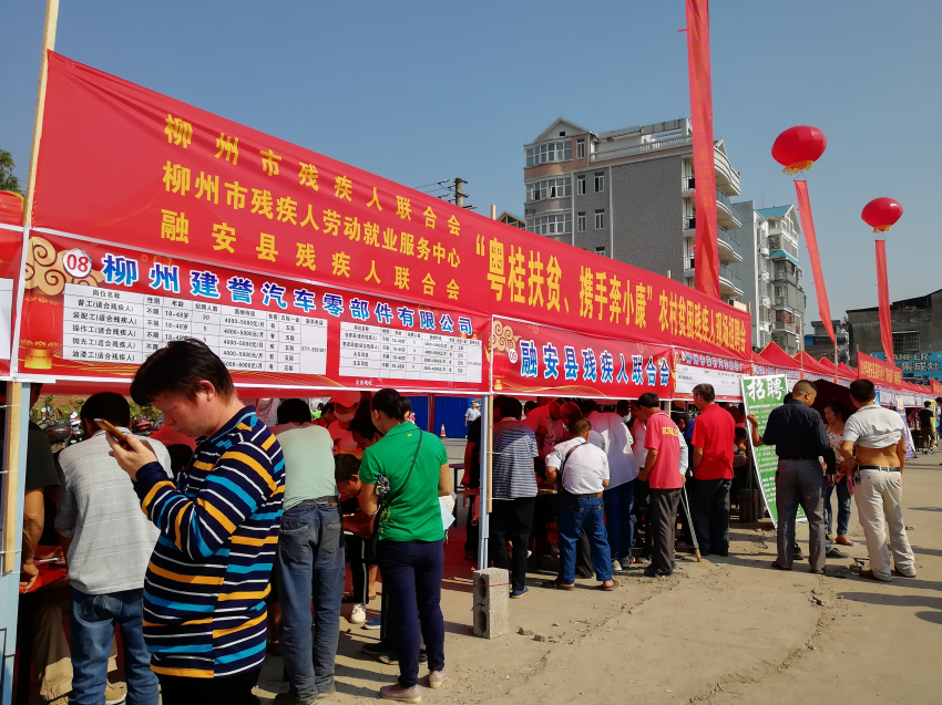 9月29日,由融安、遂溪两县残联、人社部门在融安县大码头广场举办残疾人专场招聘会,现场有来自广东企业、粤桂扶贫协作引进融安的企业、柳州地区等多家企业、单位前来招聘。融安县委常委、副县长刘喜出席活动。