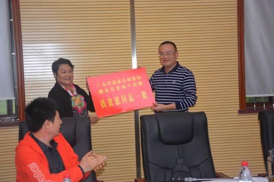 会上,遂溪县政协主席欧卫代表考察组向融安县捐赠了一批扶贫慰问品。