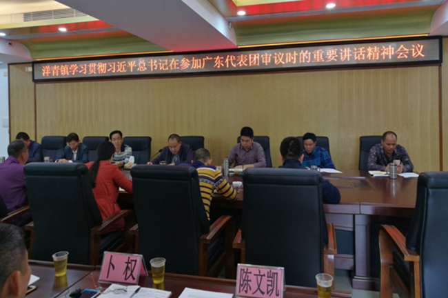 陈赵成书记要求,全镇领导干部要把学习贯彻习近平总书记在参加十三届全国人大一次会议广东代表团审议时的重要讲话精神当作当前和今后一个时期内的一项重要政治任务,深刻领会习近平总书记对广东工作的总体要求、深化改革开放、“四个走在全国前列”以及全面推进党的建设的重要要求。求真务实、真抓实干,坚决把习近平总书记重要讲话精神落到实处。并紧密结合洋青镇工作实际,认真总结,精心谋划,在新的一年强力推进广东农垦湛江垦区现代农业产业园项目、半岛原糖深加工、正大加工等重点项目建设,探索具有洋青特色的现代生态农业发展道路,大力推进十大健康养生农业产业园区建设,稳步推进精准扶贫工作,扎实推进新农村建设等,为夺取全面建成小康社会新胜利,建设生态、文明、法治、和谐新洋青而努力奋斗!(供稿:梁若梅 陈嘉)