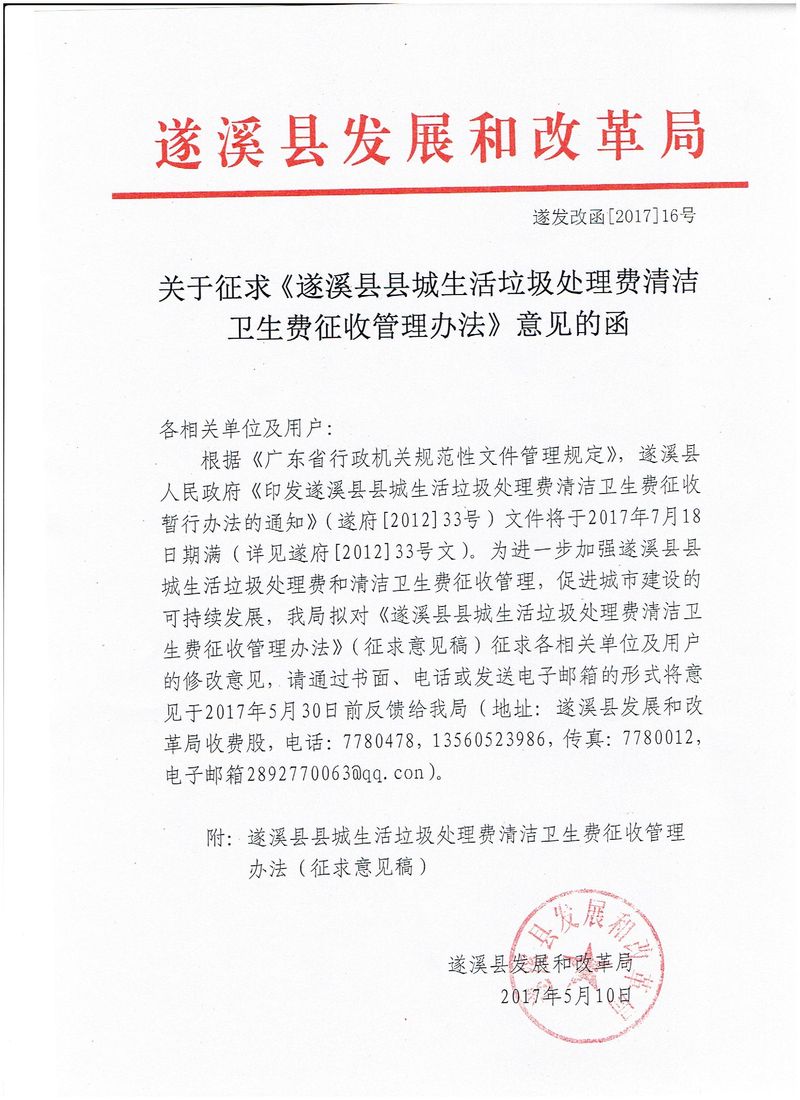 关于征求县城生活垃圾处理费清洁卫生费征收管理办法意见的函 | | 作者: | 来源:本网 | 时间:2017-05-10 15:49:39 点击数:- 遂溪县县城生活垃圾处理费清洁卫生费征收管理办法(征求意见稿) 【打印正文】