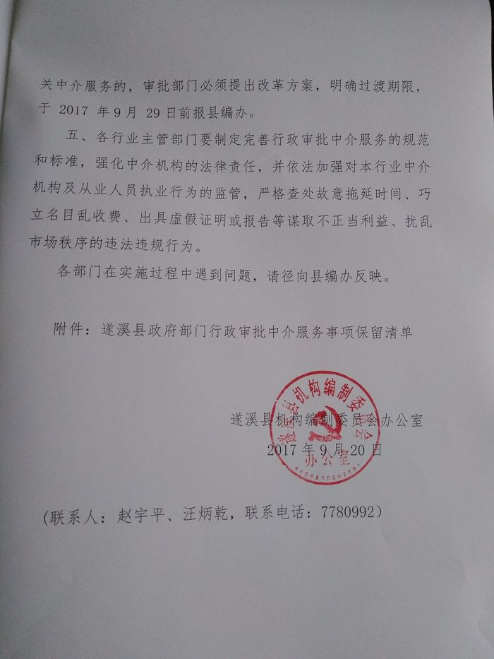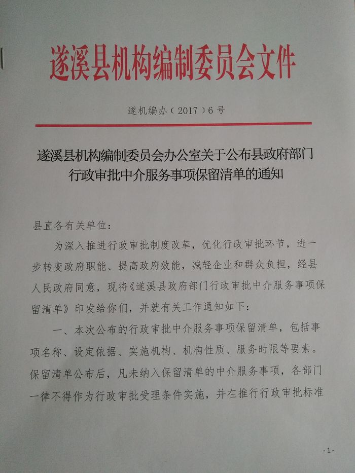 遂机编办【2017】6号遂溪县政府部门行政审批中介服务事项保留清单 | | 作者:县编办 | 来源:县编办 | 时间:2017-10-12 15:22:19 点击数:- 遂机编办【2017】6号遂溪县政府部门行政审批中介服务事项保留清单 【打印正文】