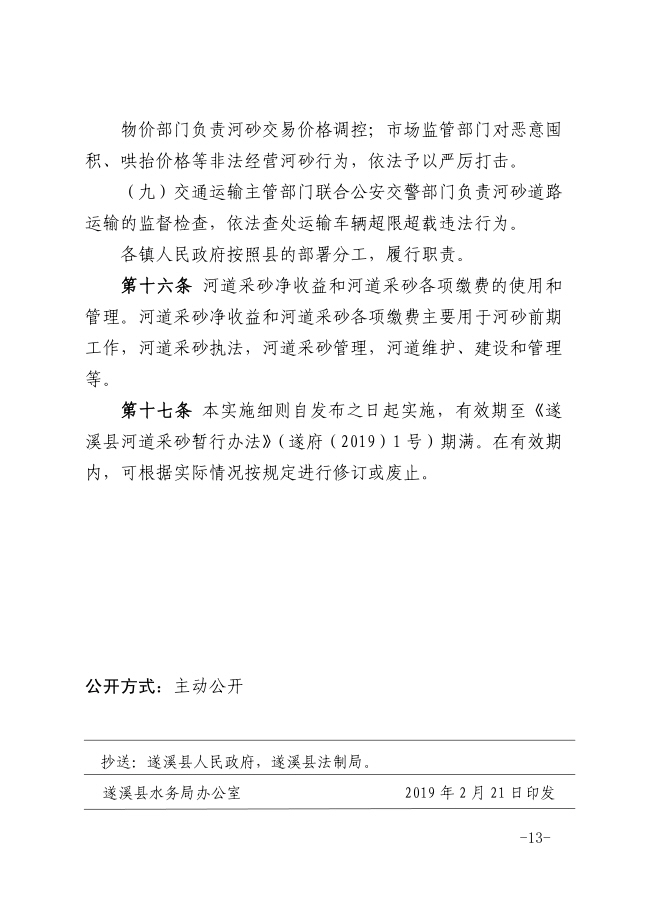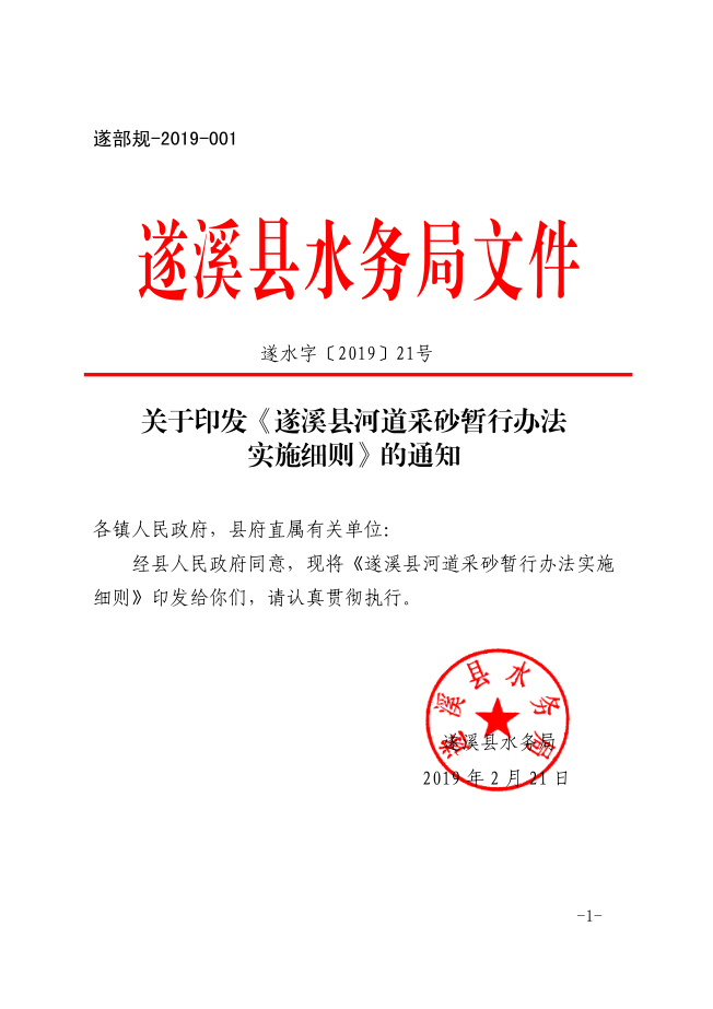 遂部规—2019—001 遂溪县河道采砂暂行办法实施细则(遂水字〔2019〕21号) | | 作者:县水务局 | 来源:县水务局 | 时间:2019-02-22 16:46:13 点击数:- 关于印发《遂溪县河道采砂暂行办法实施细则》的通知.pdf政策解读链接:《遂溪县河道采砂暂行办法》政策解读 【打印正文】