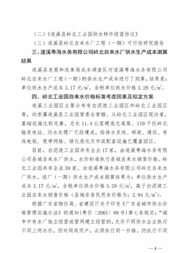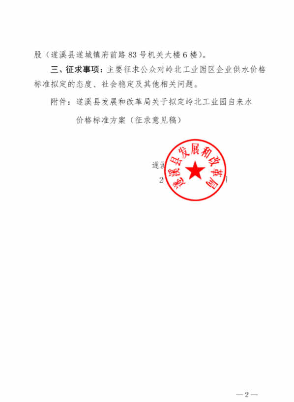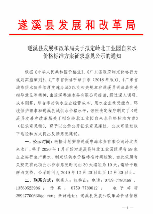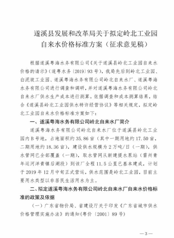 遂溪县发展和改革局关于拟定岭北工业园自来水价格标准方案征求意见公示的通知