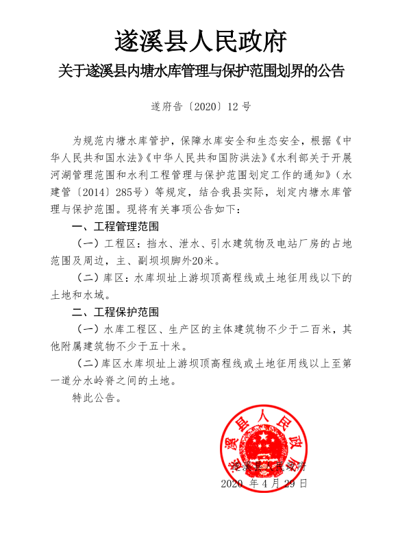关于遂溪县内塘水库管理与保护范围划界的公告