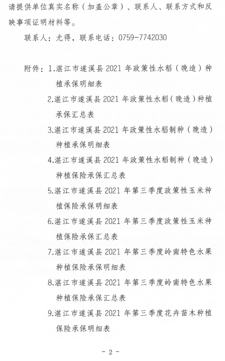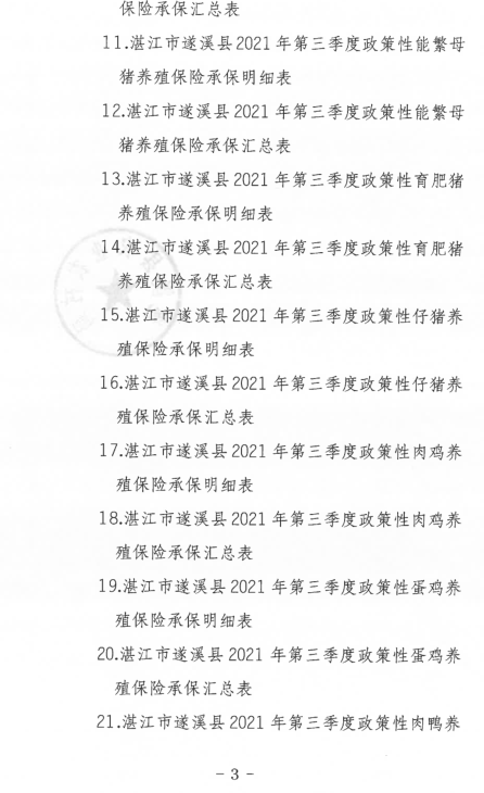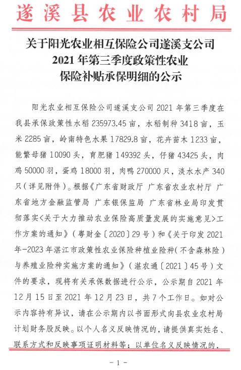 关于阳光农业相互保险有限公司遂溪支公司2021年三季度政策性农业保险补贴承保明细的公示 | | 作者: | 来源:本网 | 时间:2021-12-15 09:50:59 点击数:- 附件:2021年第三季度遂溪县政策性农业保险承保明细表及汇总表.pdf 【打印正文】