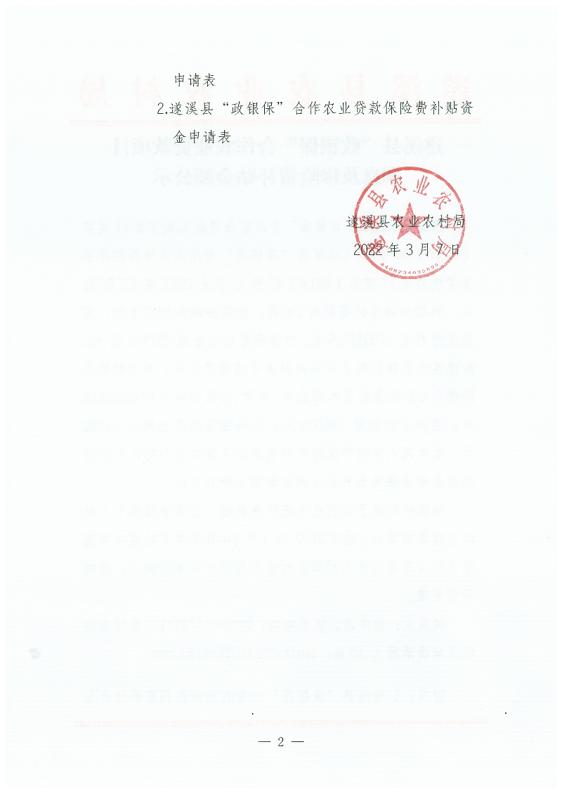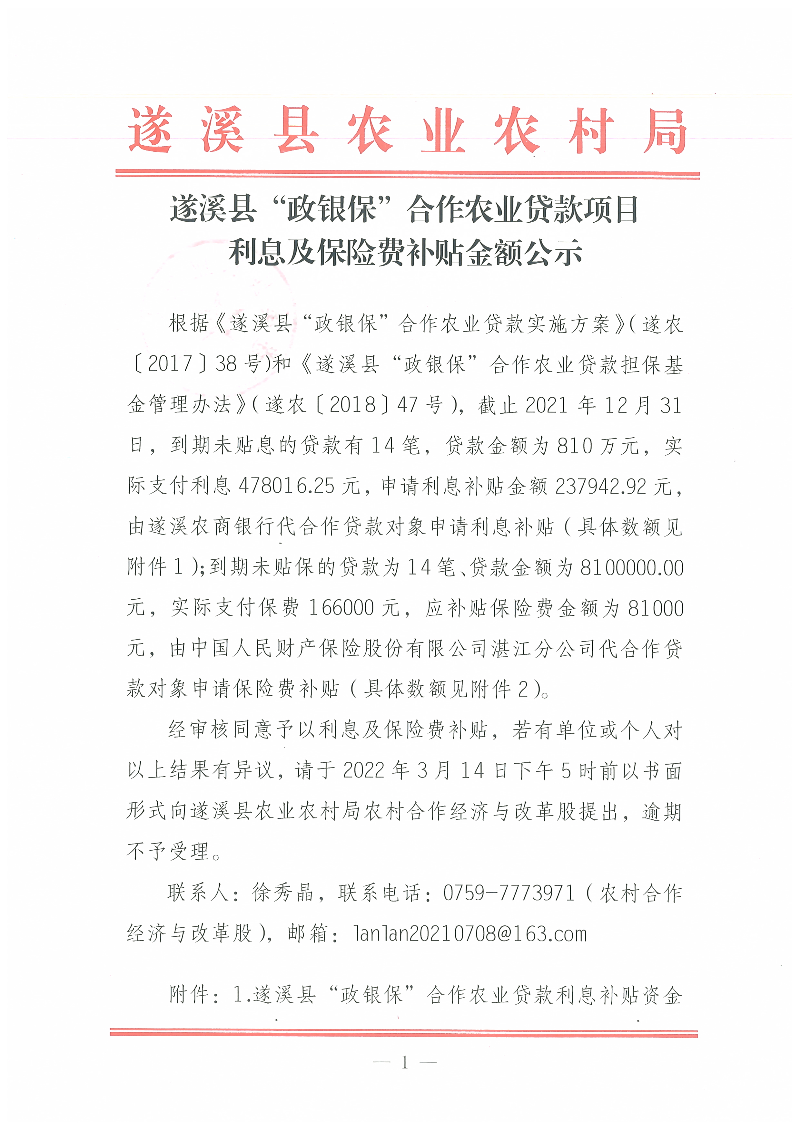 遂溪县“政银保”合作农业贷款项目利息及保险费补贴金额公示