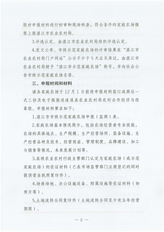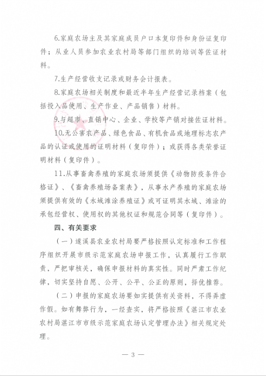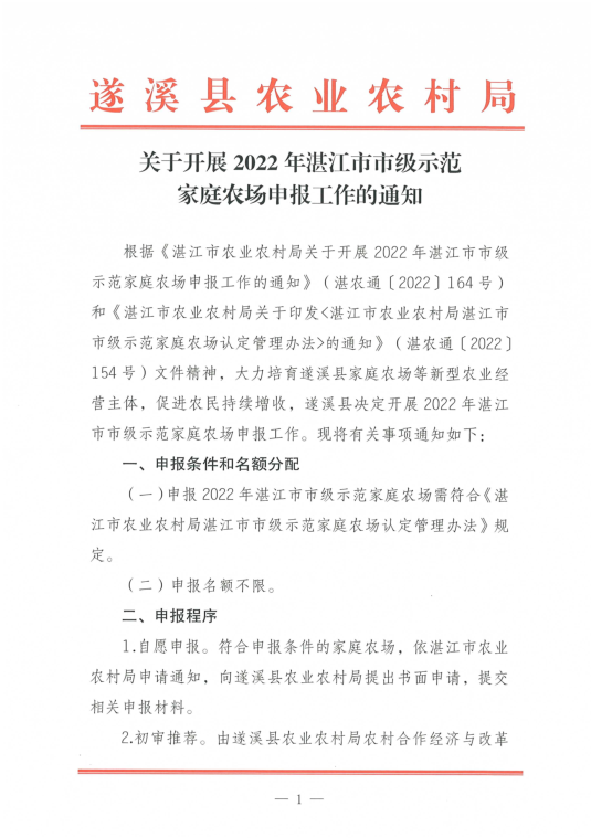 关于开展2022年湛江市市级示范家庭农场申报工作的通知 | | 作者: | 来源:本网 | 时间:2022年-11月-10日 点击数 附件:湛江市农业农村局关于开展2022年湛江市市级示范家庭农场申报工作的通知.pdf 分享到: 【打印正文】