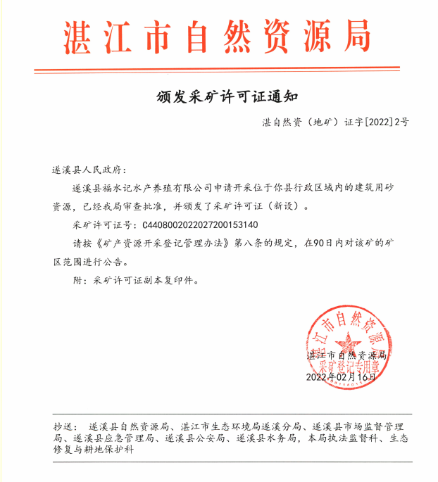 颁发采矿许可证通知 湛自然资(地矿)证字[2022]2号