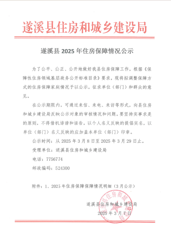 遂溪县2025年住房保障情况公示 | | 作者: | 来源:遂溪县住房和城乡建设局 | 时间:2025-03-07 17:31:36 点击数:- 2025年住房保障调整家庭明细(3月公示).xlsx 【打印正文】